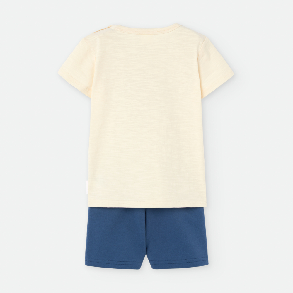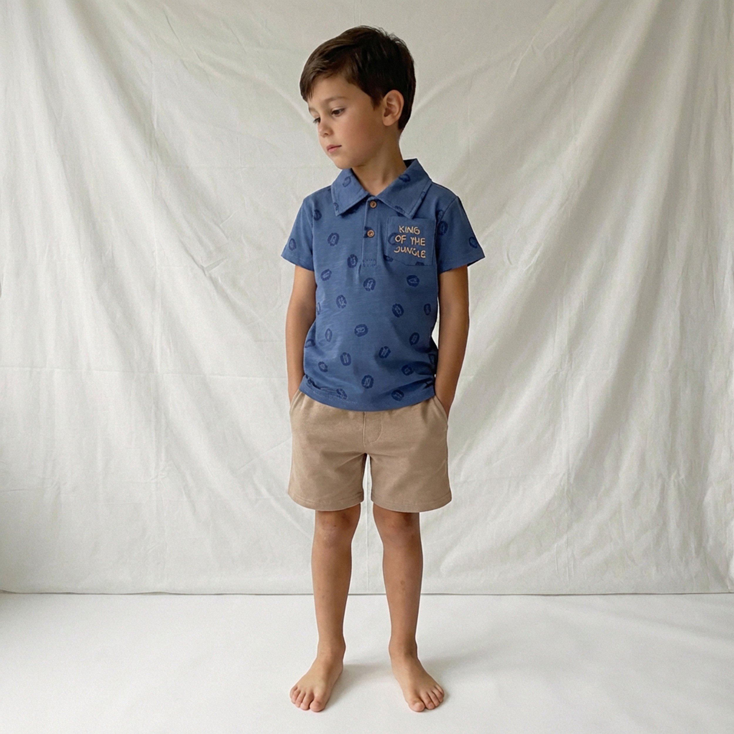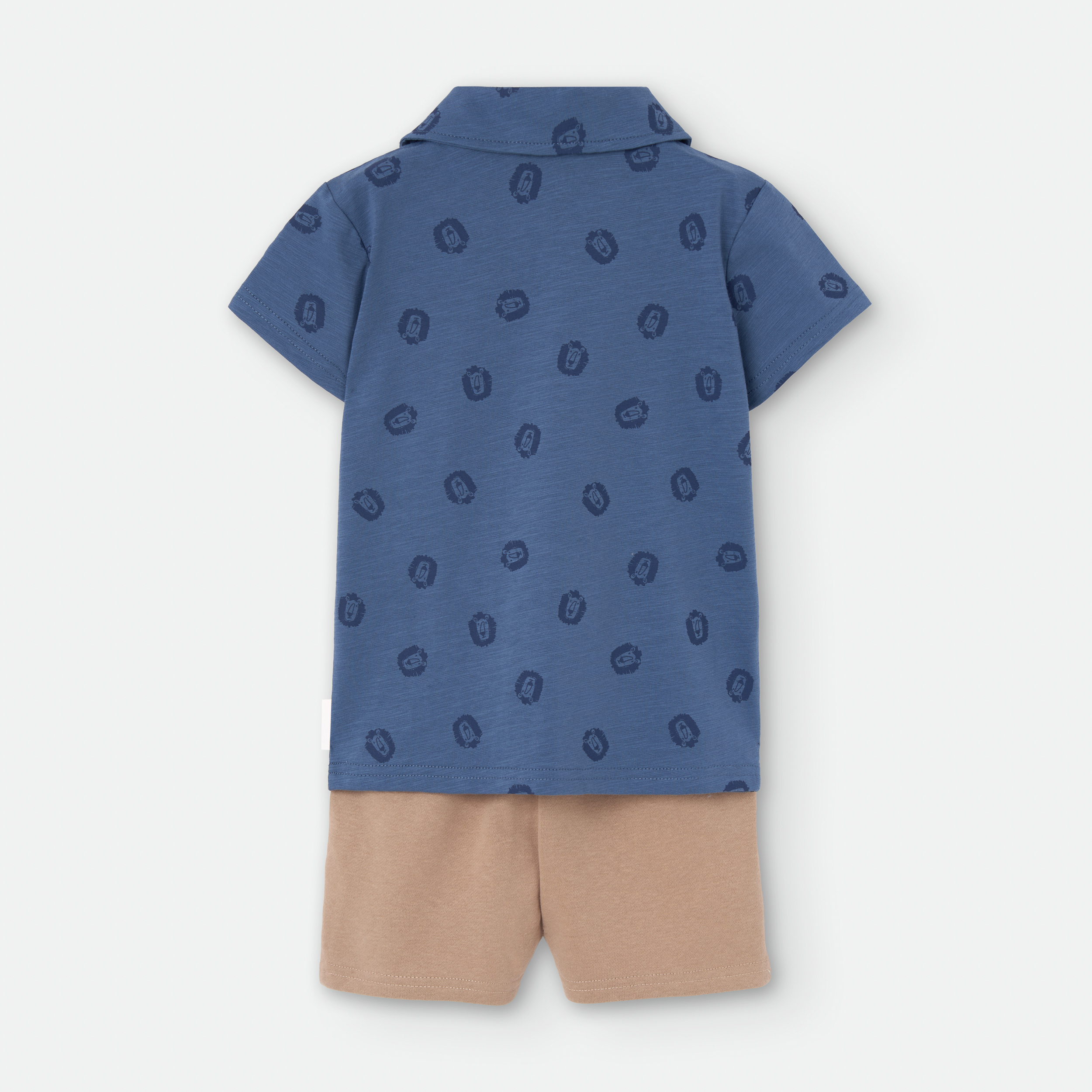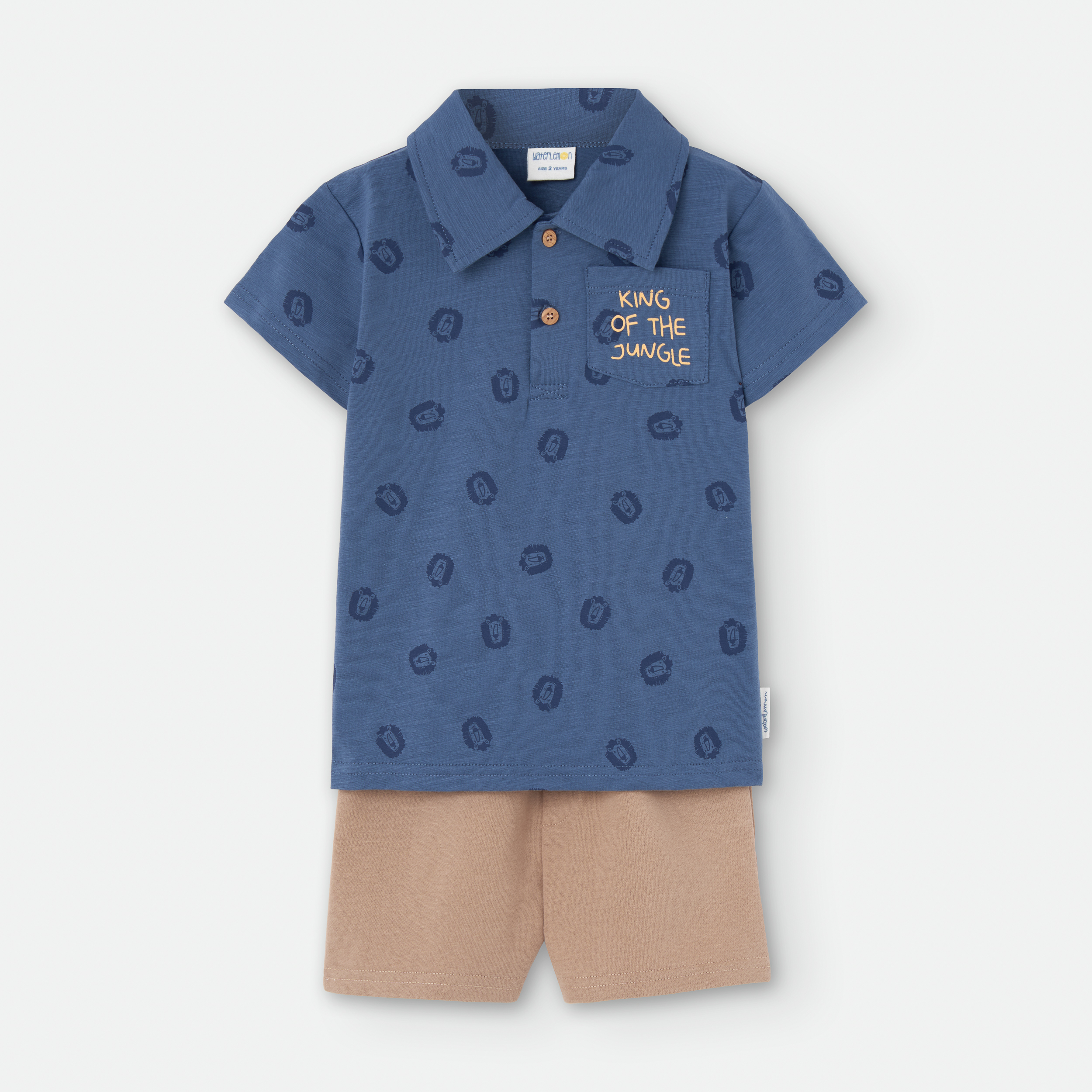«CONJUNTO DOS PIEZAS. CAMISETA TIPO POLO CON TAPETA, BOTONES Y BOLSILLO EN EL PECHO. ESTAMPADO DE LEONES SOBRE FONDO COLOR AZUL.