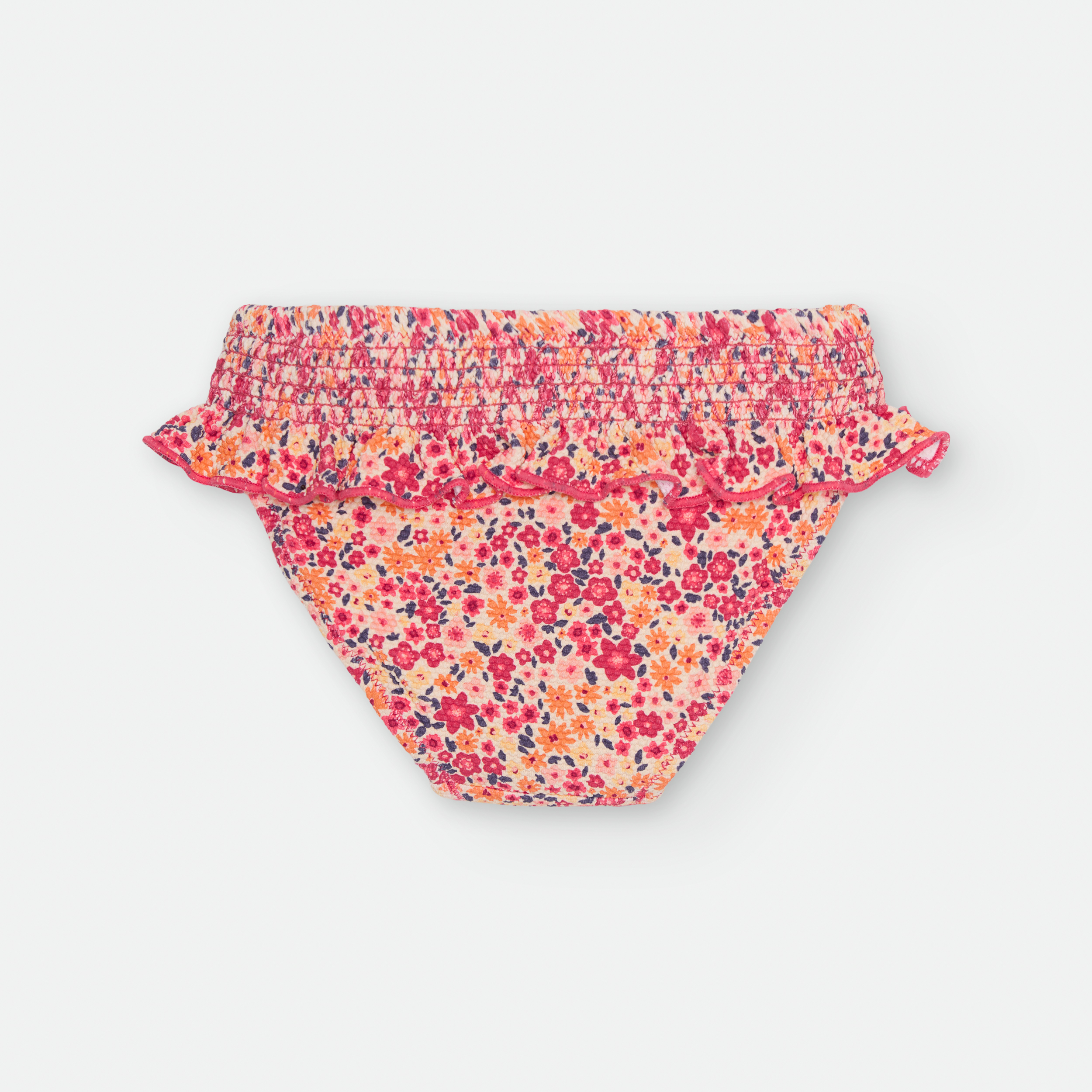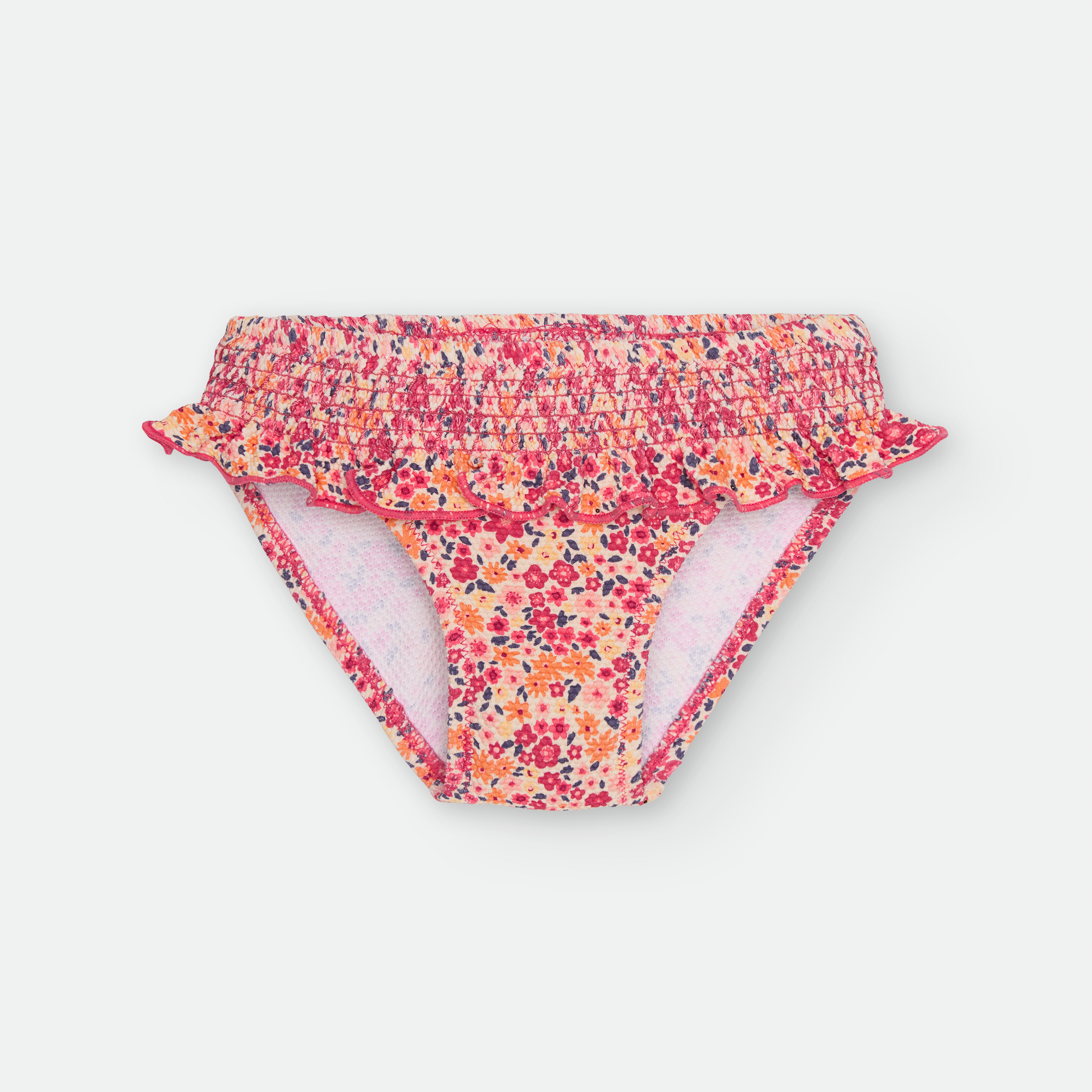 «BRAGUITA DE BAÑO CON CINTURILLA ELÁSTICA, DETALLE NIDO DE ABEJA Y VOLANTE.
