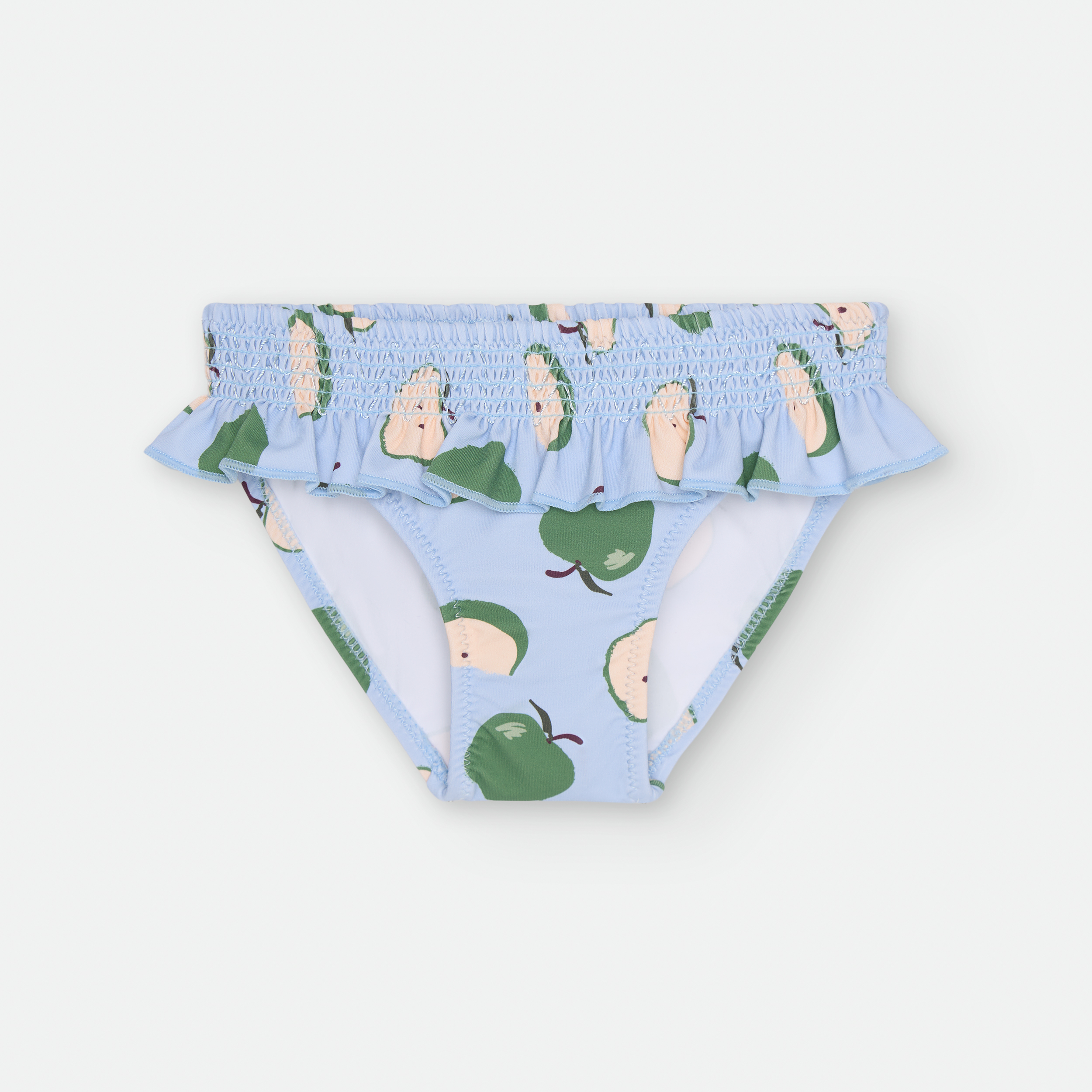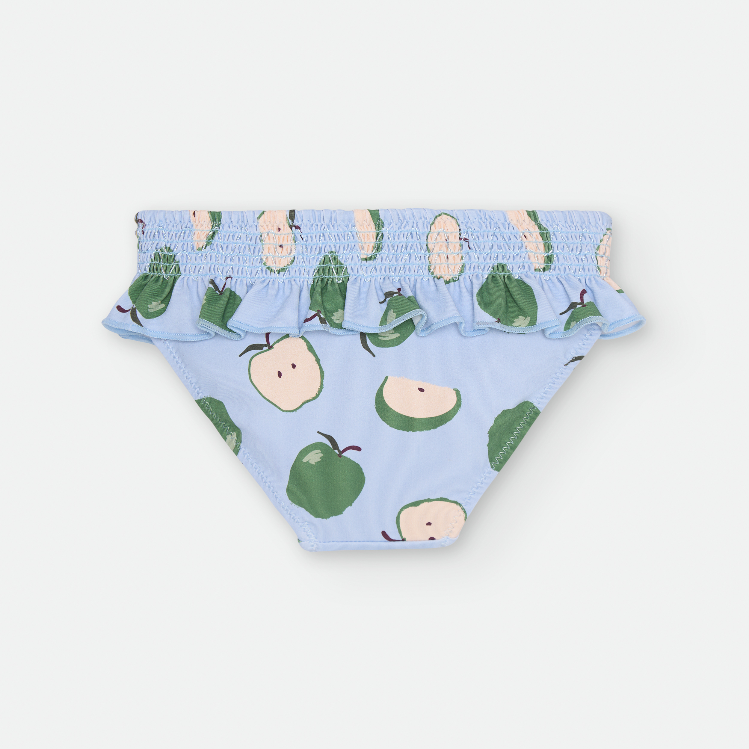 «BRAGUITA DE BAÑO CON CINTURILLA ELÁSTICA, DETALLE NIDO DE ABEJA Y VOLANTE.