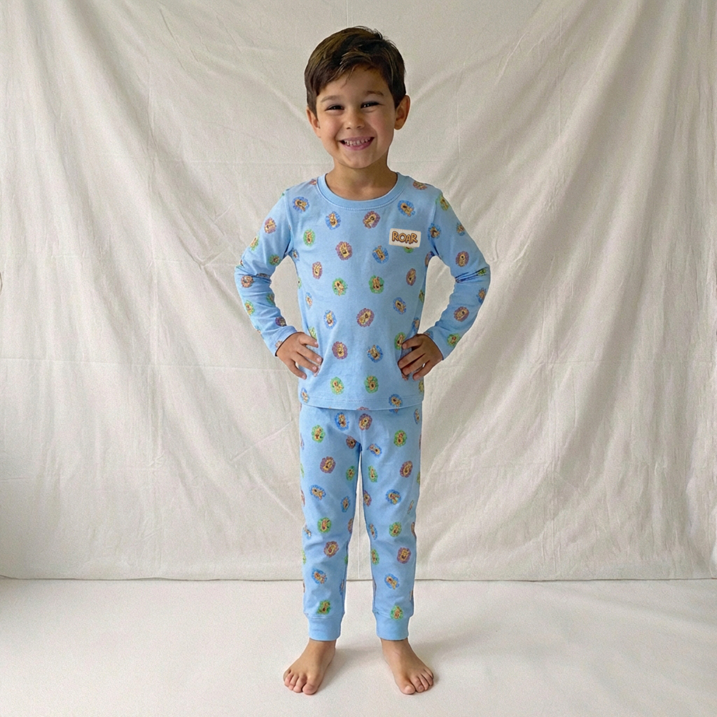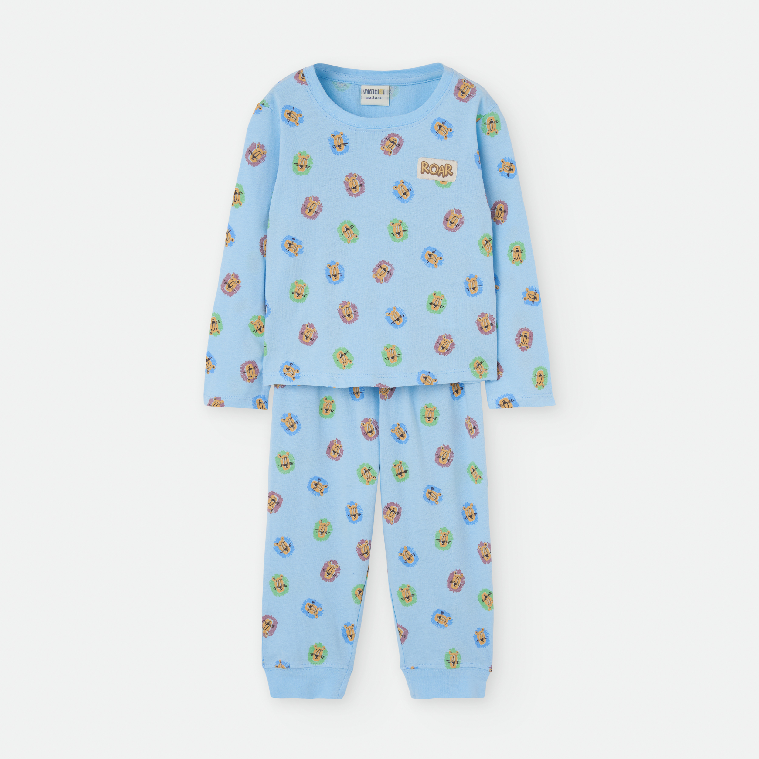PANTALÓN LARGO CON CINTURILLA ELÁSTICA Y ESTAMPADO DE LEONES SOBRE FONDO COLOR AZUL. ACABADO CON PUÑO EN EL BAJO EN COLOR AZUL.»