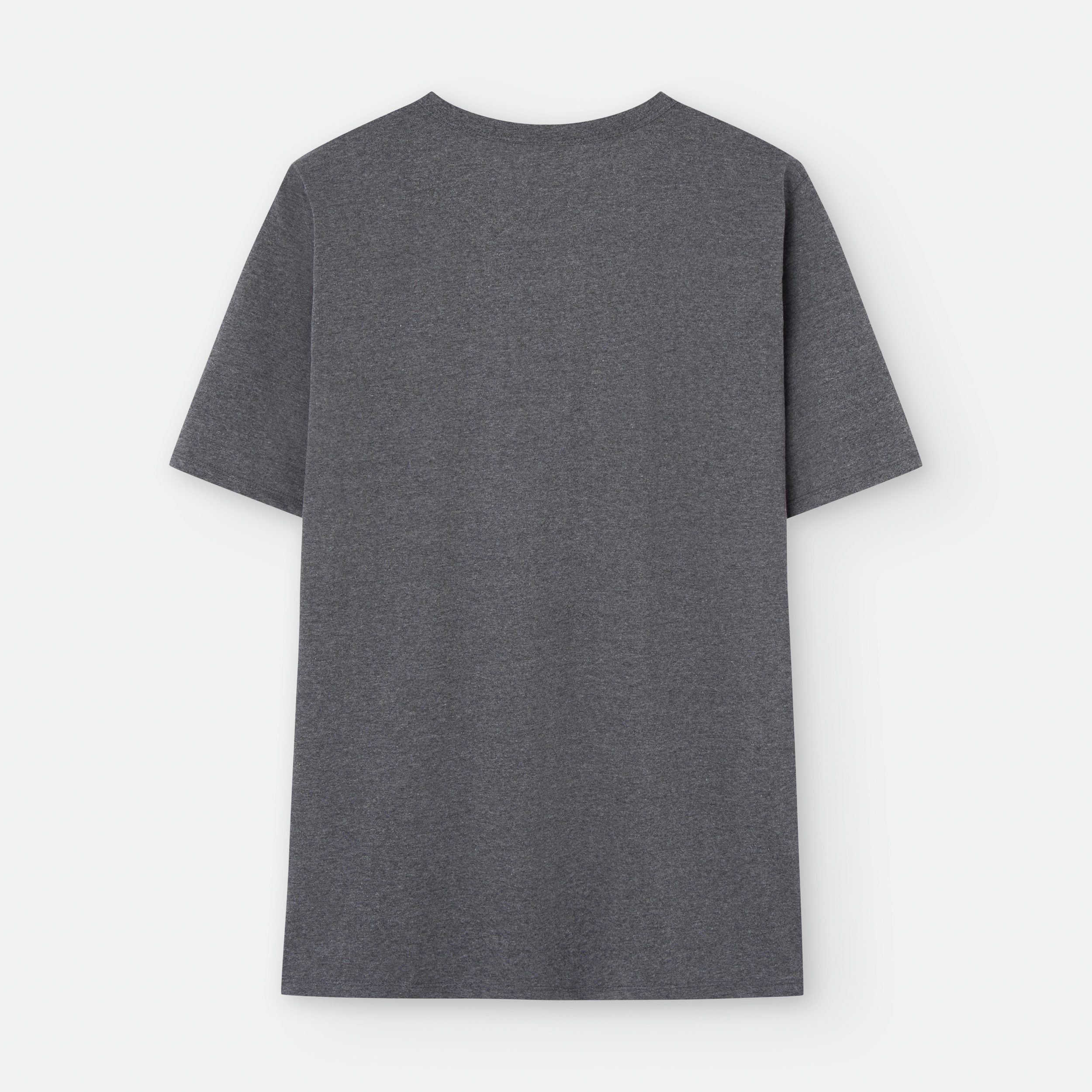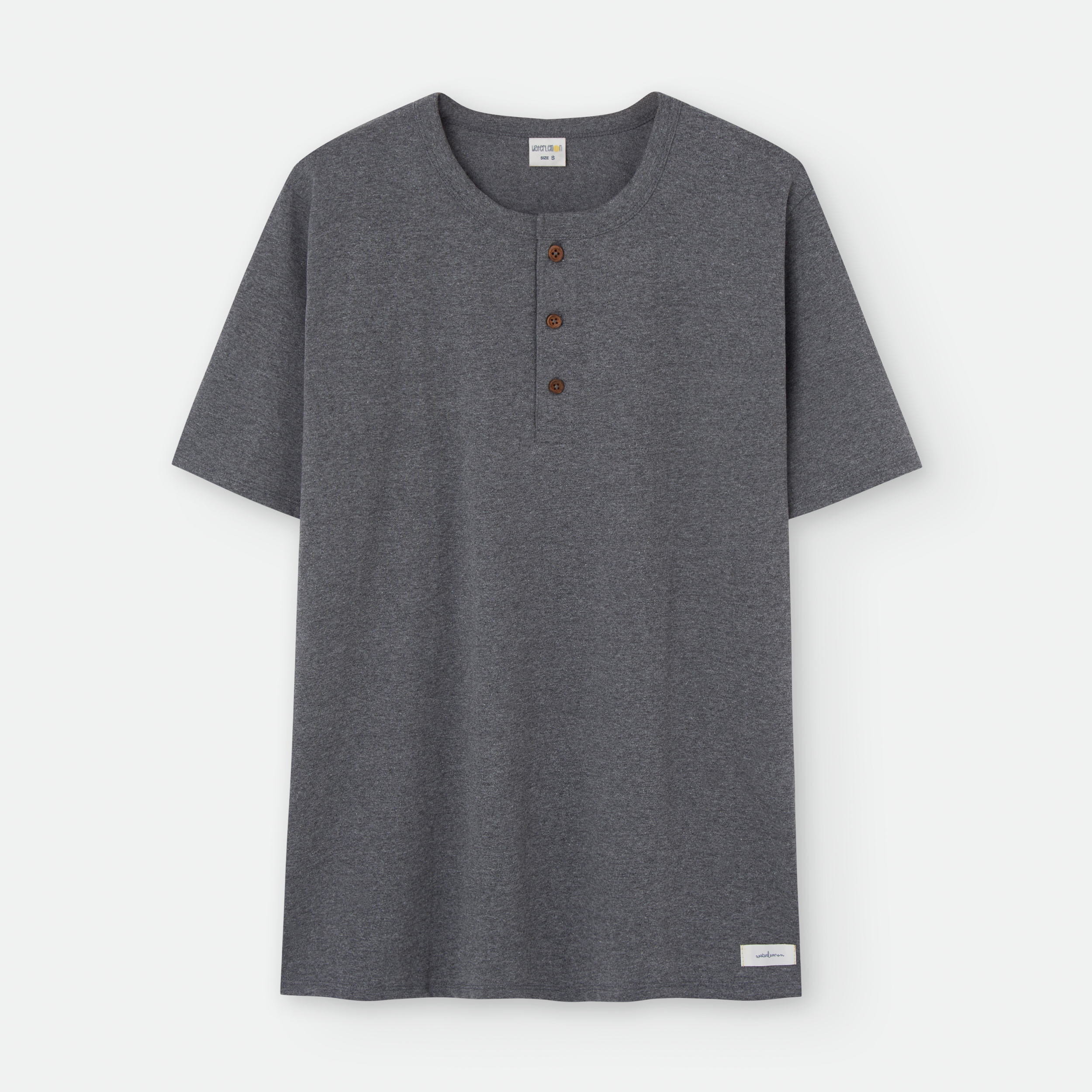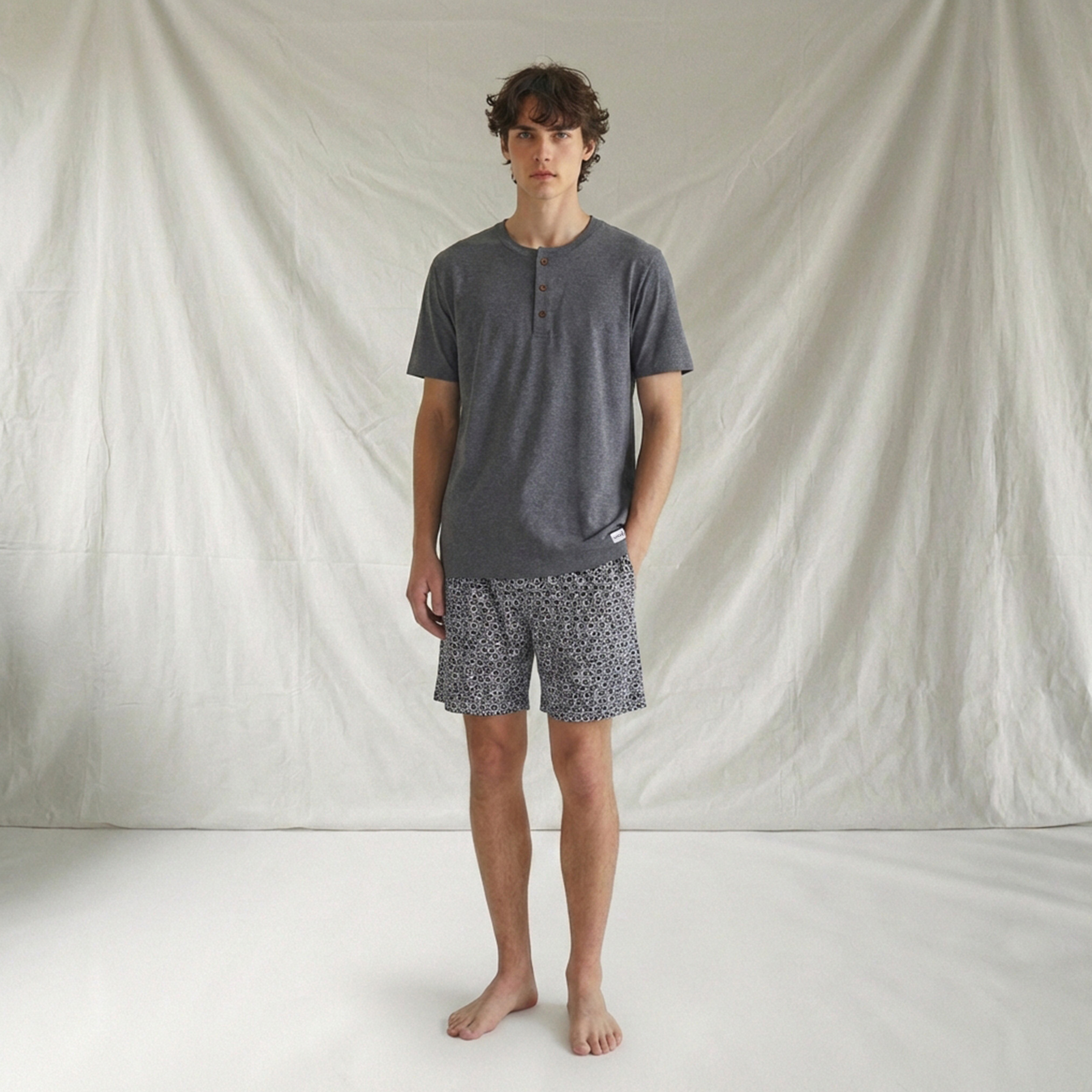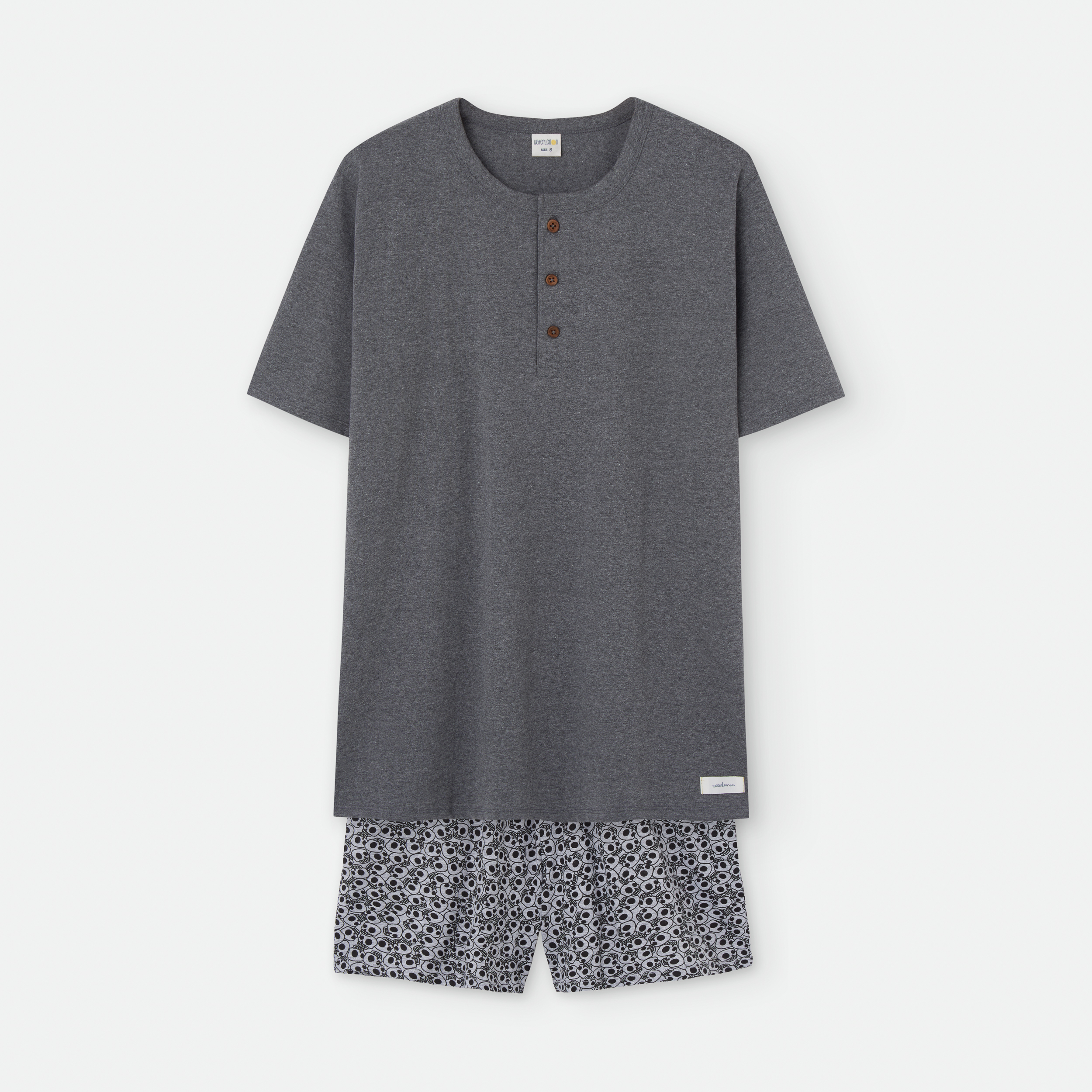 «PIJAMA DOS PIEZAS. CAMISETA EN COLOR GRIS VIGORÉ OSCURO CON ESCOTE REDONDO, TAPETA CON BOTONES Y MANGA CORTA.