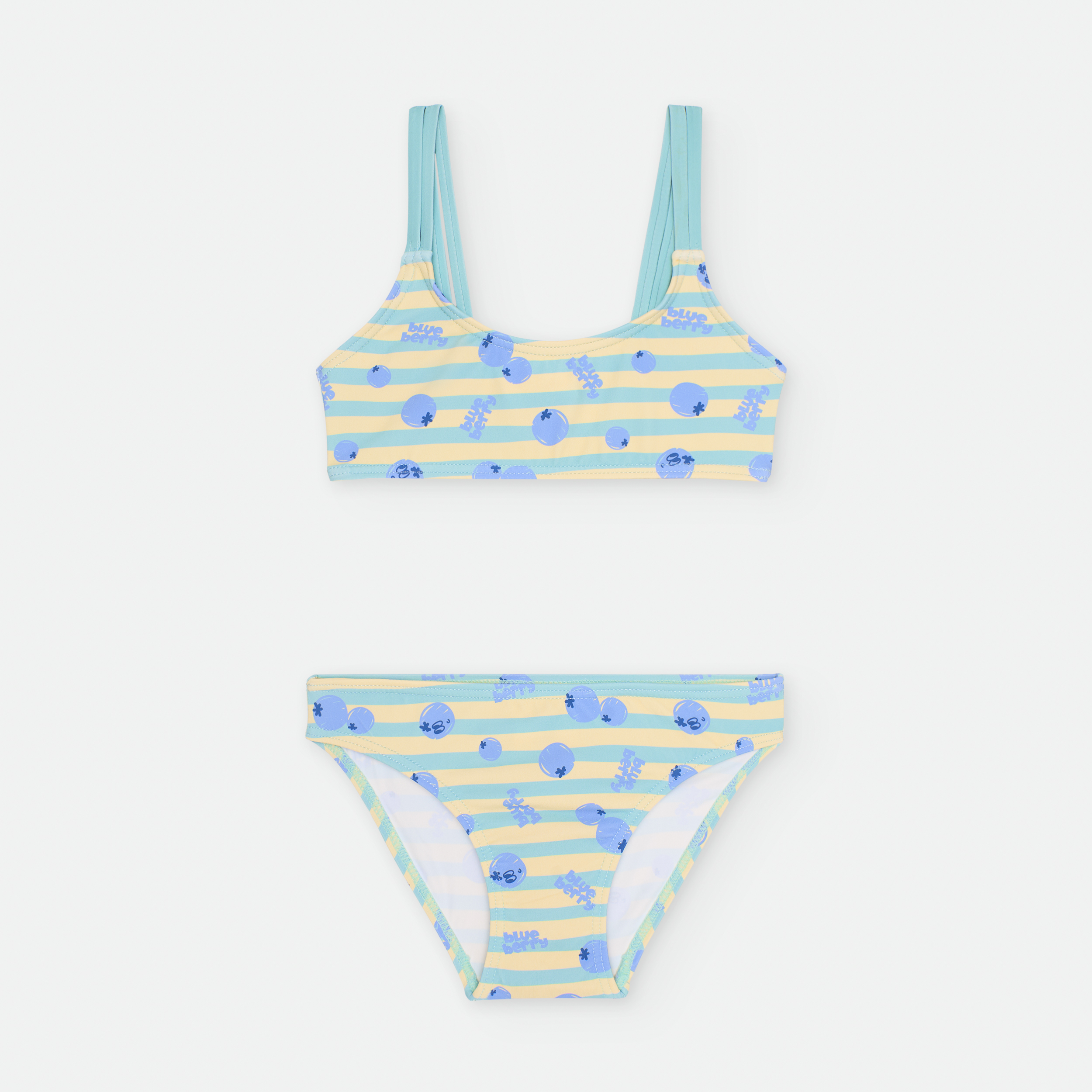 «BIKINI DOS PIEZAS. TOP ESCOTE REDONDO CON COPA EXTRAÍBLE A PARTIR DE LA TALLA 10 AÑOS, SIN AROS Y DOBLE TIRANTE A CADA LADO.