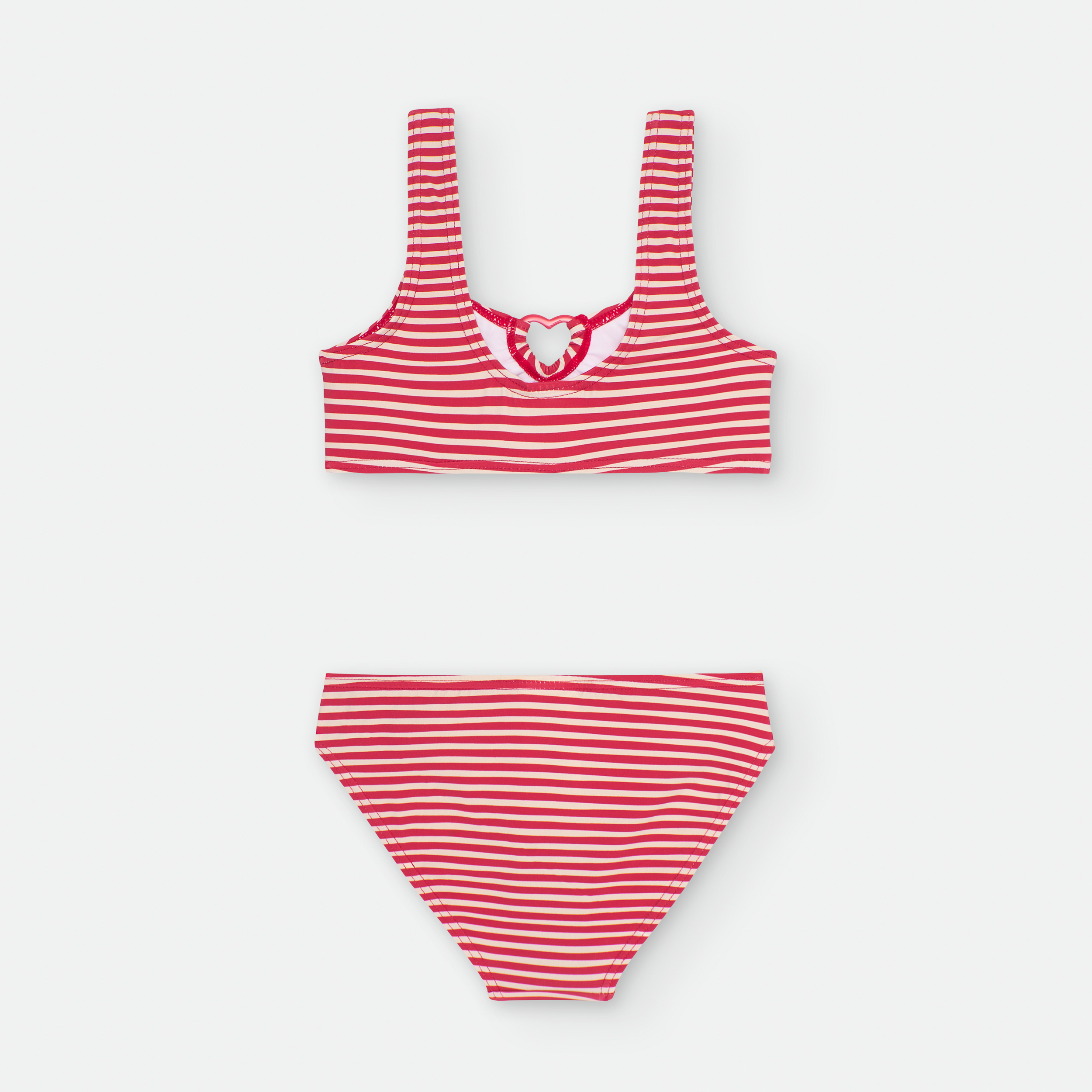 «BIKINI DOS PIEZAS. TOP ESCOTE REDONDO CON COPA EXTRAÍBLE A PARTIR DE LA TALLA 10 AÑOS, SIN AROS Y ANILLA DE FANTASÍA EN FORMA DE CORAZÓN.
